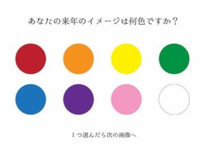 さて、年末にカラーで楽しんでいただきたく、来年の色を選んでいただくカラーセラピーを考えてみました。あくまでも私の、今の、浮かんだイメージですので、その前提でお楽しみ下さい。もし何か思い当たる事があるようでしたら、その色を来年のラッキーカラーにしてみるのもいいかも知れません(^^)
